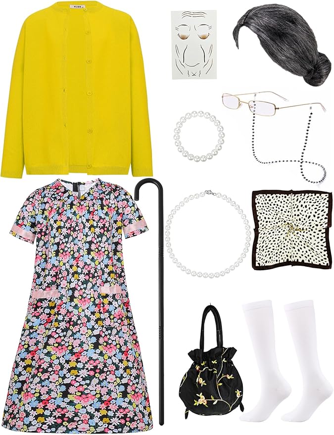 • High Quality Materials: To ensure the comfort and durability of grandma costume for kids, this old lady dress and knitwear is made of soft, breathable, and lightweight fabric, making your girls comfortable all day long. Old lady wig is made of high-quality synthetic fibers, which look and feel like real hair, ensuring Grandma's authenticity.