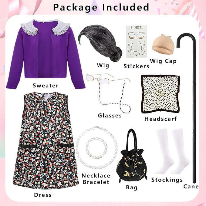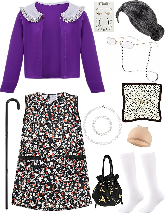 - Cute Kids Old Lady Costume Set: Watch your little daughter transform into a cute grandma with the 100 days of school old lady outfit designed by ZFQI for girls! The package includes a comfortable grandmother dress, purple knitwear, a realistic old lady wig, glasses with glasses chains, necklace, bracelet, earrings, handbag, scarf, brooch, gloves, socks, tattoo stickers, and a cane.
