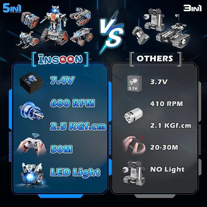 - ✅ 5 IN 1 EDUCATIONAL BUILDING TOY - INSOON tech building set offers 5 diverse building options, including racing tank, technology robot, stunt vehicle, tracked car or sledge. It encourages children to explore different designs, fostering their creativity and imagination. This comprehensive learning experience combines science, technology, engineering, and mathematics, providing hands-on activities and challenges to enhance problem-solving skills