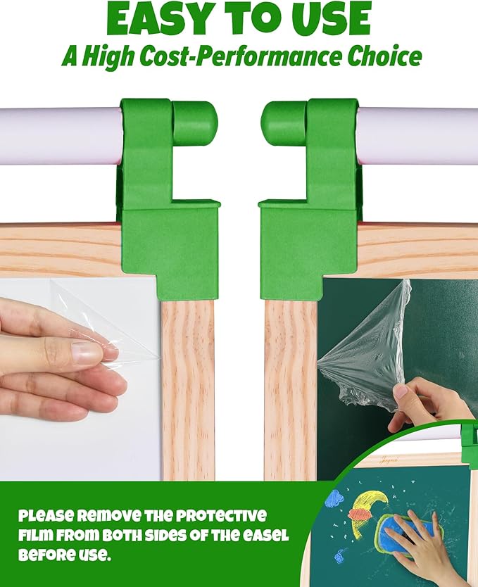 - 【ABUNDANT ACCESSORIES 】-- Considering the details of the painting, we will provide a complete set of parts for the kids art easel for kids, including 1 roll of 16inch drawing paper, 1 green storage box, 1 box of dust-free chalk, 4 markers (black, green, red and blue), 1 big erasers, colorful magnetic letters and math set.