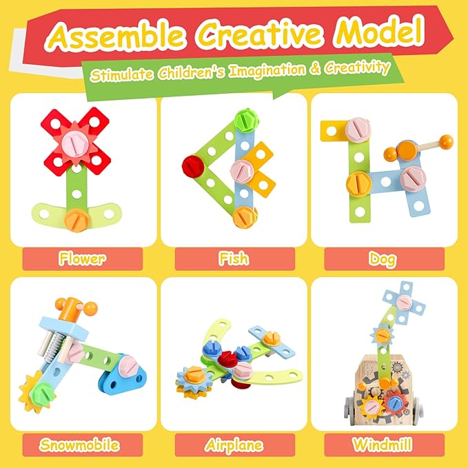- SAFE CONSTRUCTION TOYS: Made of non-toxic and child-safe material with smooth, burr-free surface. Assembling wooden blocks, screws, nuts, wheels, wooden box, and boards, what kind of models can child put together using these accessories? This tool set for toddlers 3-5 is a good choice to unleash children's imagination. Flower, fish, dog, airplane or different displays on the tool bench board according to different moods, looking forward to you sharing the unique models you and your child create