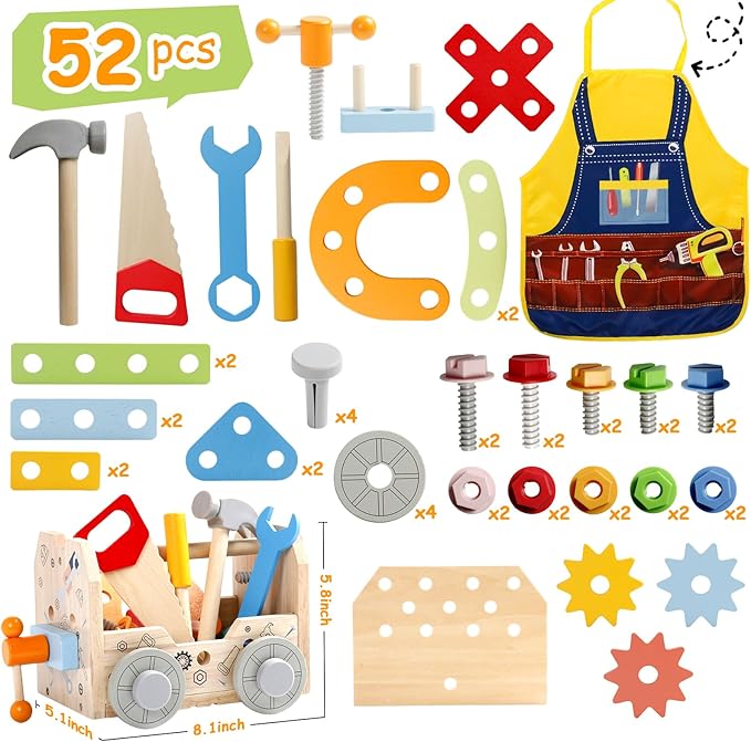 - WOODEN TODDLER TOOLS TIPS: This tool set includes 1 wooden tool box with handle, 4 tools (hammer, screwdriver, wrench, saw), 4 wheels, 4 nails, 10 screws(6 short+ 4 long), 10 nuts, 3 gears, 12 assembly block, 1 wooden block, 1 rotate handle, 1 wooden board, 1 kid apron. The size of the tool bench/tool box: 8.1 inch x 5.1 inch x 5.8 inch. Please read and check the size of the item carefully before purchase. Please play toys under the supervision of an adult
