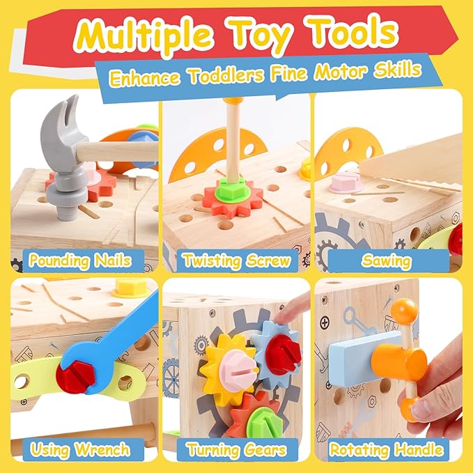 - STEM MONTESSORI TOYS FOR 3+ YEAR OLD: Multi-tools for exercising toddler's fine motor skills, hand-eye coordination skills, and promoting brain development. Wooden tools for toddlers age 2-4 to use hammer to attach nails and wheels to the toolbox. A screwdriver for twisting screws, a wrench for tightening or loosening nuts, a mini wooden saw for sawing. Smooth and non-sharp construction toys tool set keep children safer when they play the role of carpenters or engineers