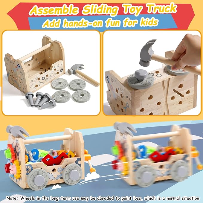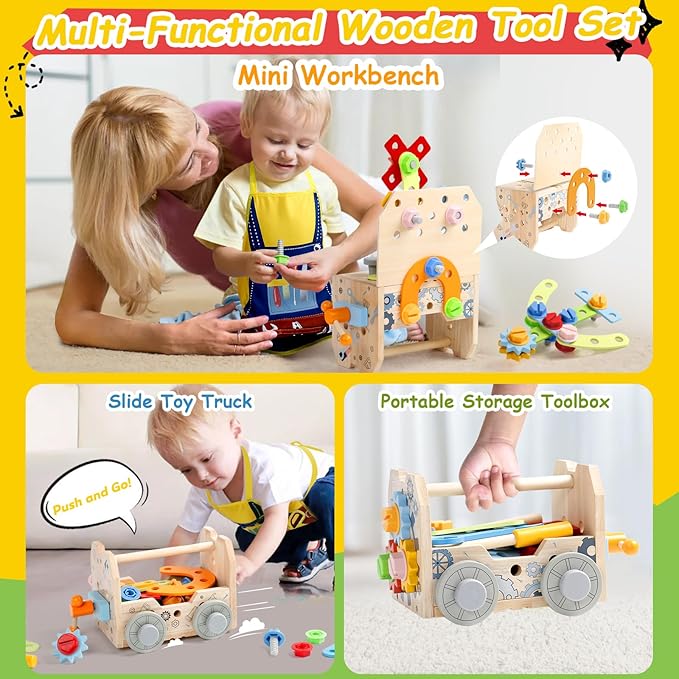 - MULTI-PURPOSE TODDLER TOOL SET: With the addition of wheels, it's a toy cart that slides, let kids enjoy hands-on fun. It can be a portable tool case to take it out anywhere. Turn it over and add the small wooden board, it becomes a mini work tool bench, try to use toy tools on it! When child is done playing, put all the accessories in the box and it becomes a reliable storage box. Kids will be amazed by this 4-in-1 wooden tool box! Great tool set for toddlers 2 3 4 year old boys and girls