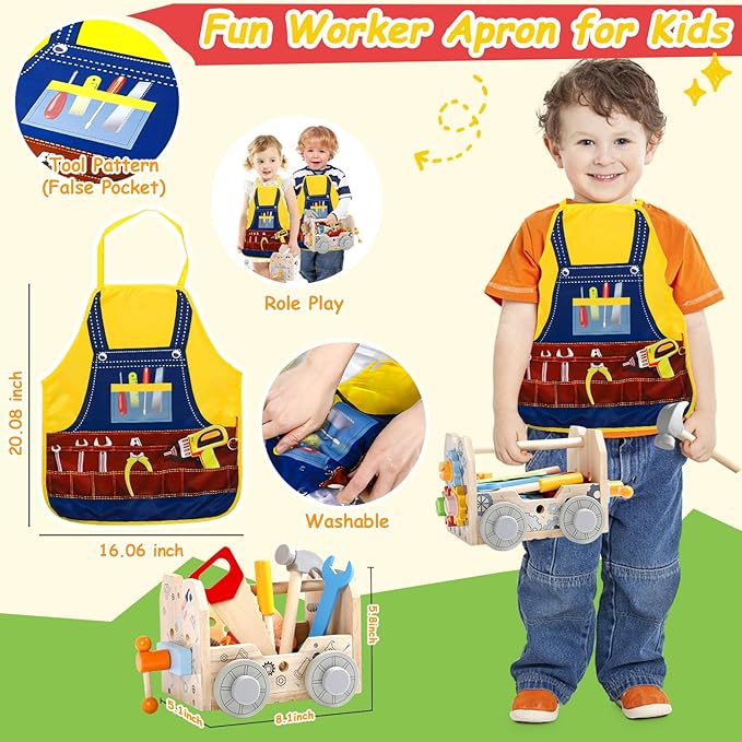 - 52 PCS KIDS TOOL SET TODDLER BOY TOYS: Cute tool pattern apron for this pretend play toddler boys girls. Put on the apron and play with toy tools, kids can enjoy hours of pretend repairman fun. Kids could also wear the cute apron for school day role-playing activity. In addition, children can also learn simple tool names and one day become your repair assistant! Nice educational toys for 2 year old and 3 year old boy gift. The size of kids apron is 20.08 inch x 16.06 inch