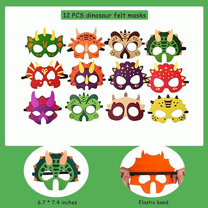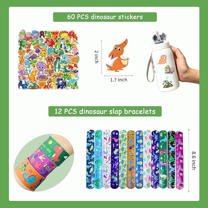 - PACKAGE - Including 12pcs dinosaur felt masks, 12pcs dinosaur bags, 12pcs dinosaur DIY stickers, 60pcs dinosaur stickers, 12pcs scracth paper bookmark, 12pcs luminous dinosaurs, 12pcs dinosaur slap bracelets, 12pcs dinosaur eggs, total 144 pieces dinosaur party supplies, will be great for kids party favors.