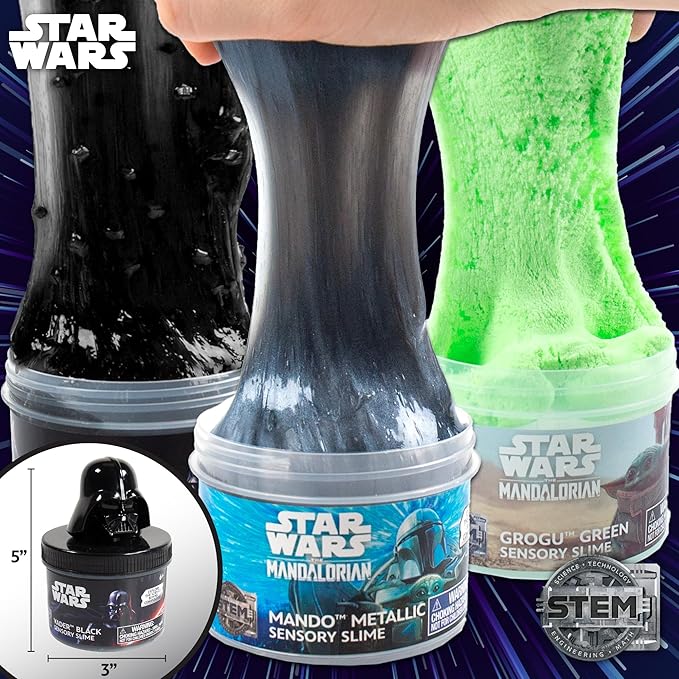 - SET INCLUDES: 3 Slimes with Collector Cards (8 oz. Darth Vader Jar of Pre-Made Black Slime with Glitter, 8 oz. Mando Jar of Pre-Made Metallic Gray Slime, 8 oz. Grogu Jar of Pre-Made Fluffy Green Slime)