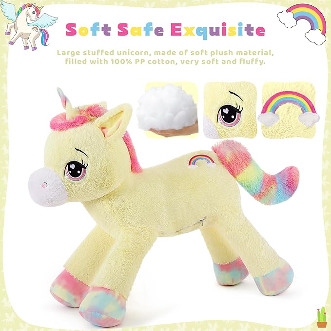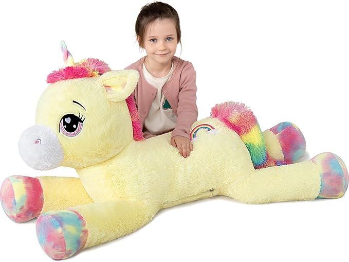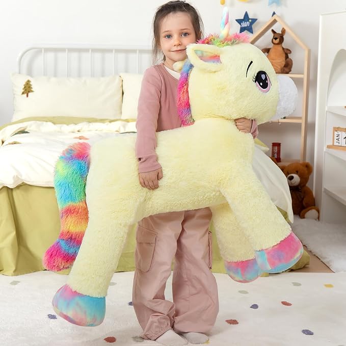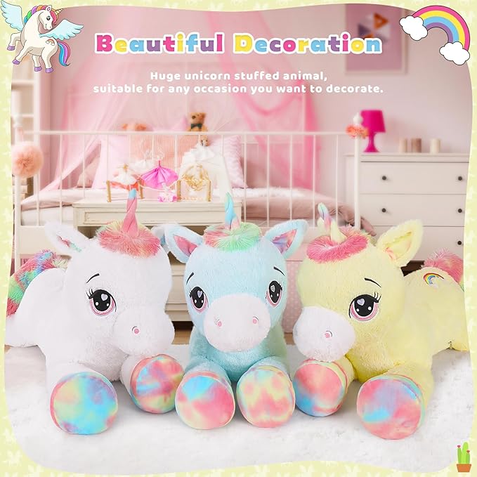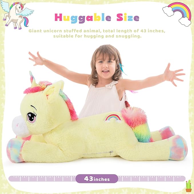 - Big Size, Safety details: Giant unicorn stuffed animal, total length of 43 inches, suitable for hugging and snuggling.Big glittery eyes of stuffed unicorn are embroidered, no sharp or detachable part on the whole body, very safe for kids. The cute and soft plush unicorn can't help letting you hug it. It will be a good companion toy