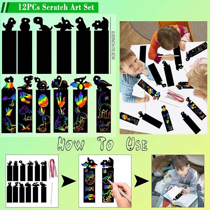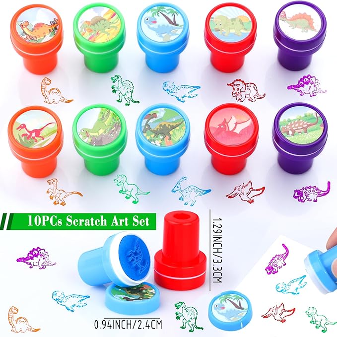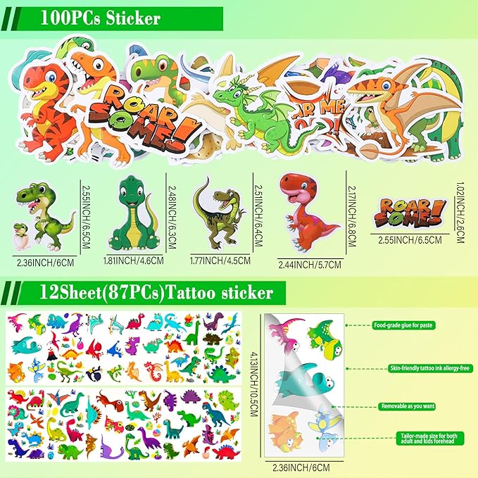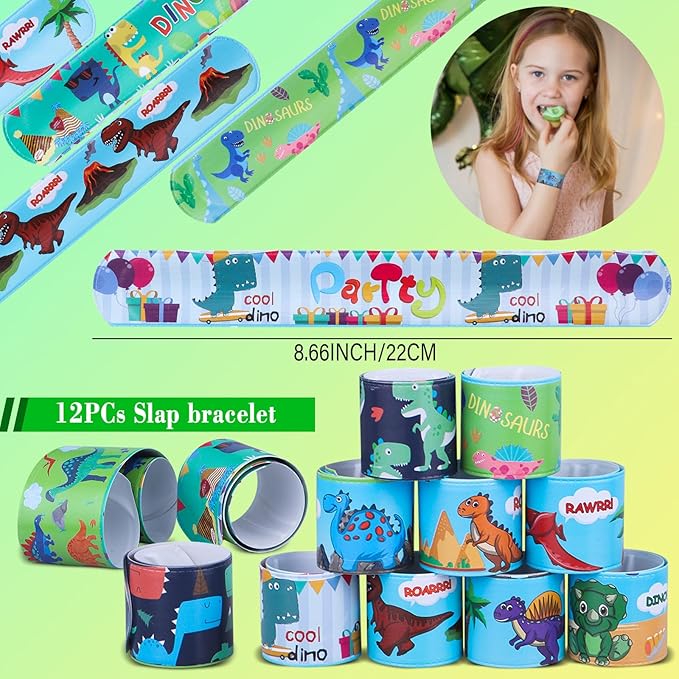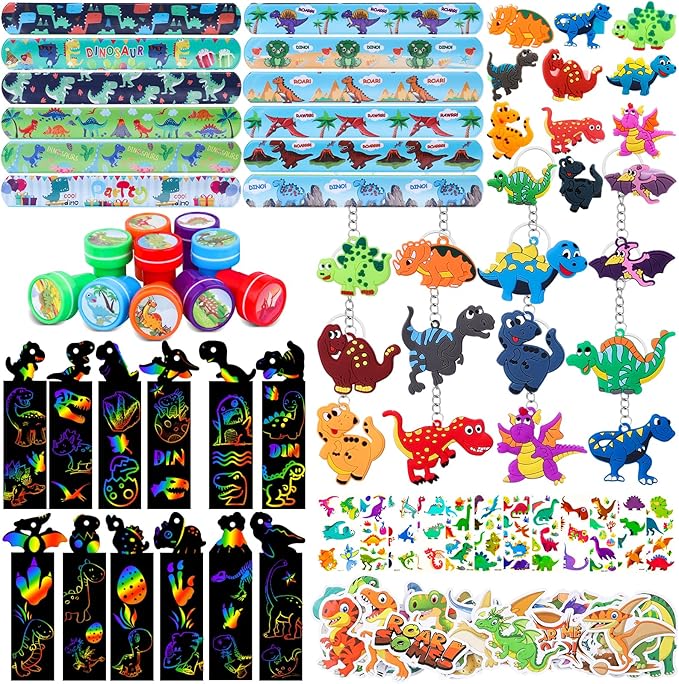 - Dinosaur PARTY FAVOR INCLUDED - 10pcs dinosaur stamp, 12pcs dinosaur slap bracelets(12 styles), 12pcs dinosaur rings(6 styles), 12pcs dinosaur keychains(6 styles), 12 sheet dinosaur temporary tattoos, 12pcs bookmarks, 50pcs dinosaur stickers. Will be a great hit for kids party favors.