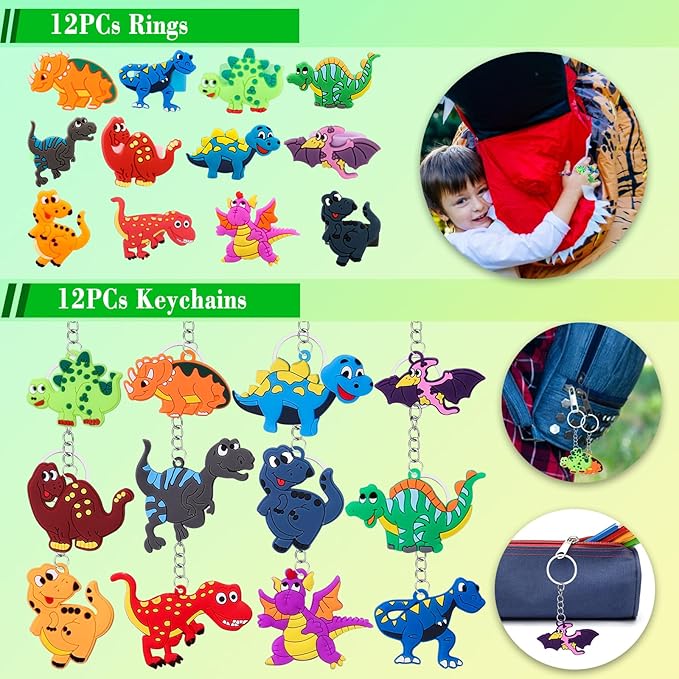 - SAFE MATERIAL - Our dinosaur keychains, dinosaur rings, dinosaur slap bracelets, dinosaur stamp, dinosaur temporary tattoos and stickers are made of non-toxic material. The dinosaur party favors is safe for children to play.