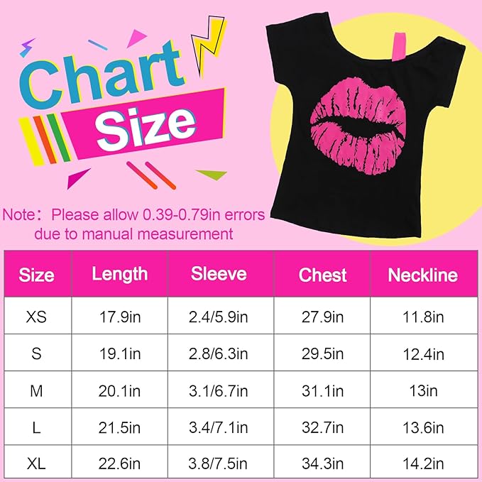 - 27pcs 80s Outfits for Girls: Women Girls 80s costume set update: extra wig with hairnet&clip included; Also contains 1 lip print neon T-shirt, 1 Rainbow colored tutu skirt, 1 hairband, 1 glasses, 1 pair of earrings, 1 pair of fishnet gloves, 1 pair of legwarmers, 4 neon beaded necklace, 10 neon beaded bracelets; Our costume comes with all the accessories you need; Our designs are inspired by the 80s and showcase the bold and vibrant style, making the 80s theme party funny and unforgettable