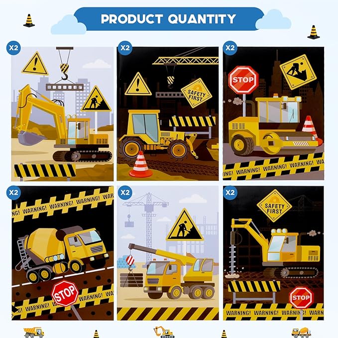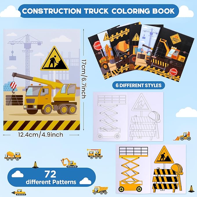 - Packaging Content: You will receive 12 construction engineering vehicle coloring books, with a total of 6 styles and 2 pieces of each. Each album contains 12 inner pages, including various patterns of construction vehicles such as excavators, bulldozers, and cranes.