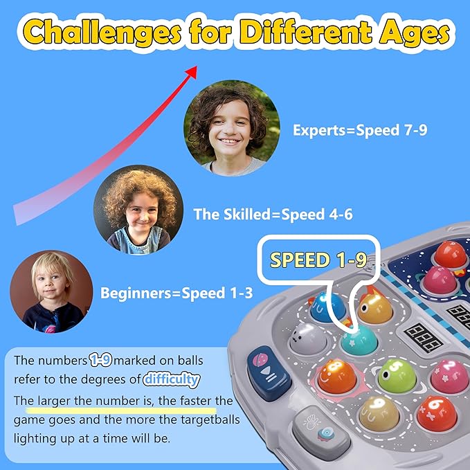 - 【9 Different Challenges】9 Speeds to choose from, with slow setting for beginners and high for the skilled. since it has more setting options to make it more or less challenging; It's fun to try and beat your top score to level up non-stop