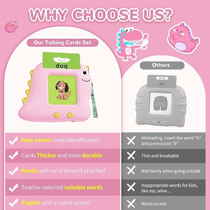 - Upgraded Tech & Content: our words and images were teacher-approved. Not like other brands including inappropriate words. And our cards are thicker and more durable for little kids to use. Not easy to damage and bend. Equipped with dual sensor barcode recognition, no worry sounds and cards do not match. Offer a wrist strap lanyard to attach, convenient for children to use outdoors, in the car, road trips and airplane. Great travel essentials busy toys for little ones.