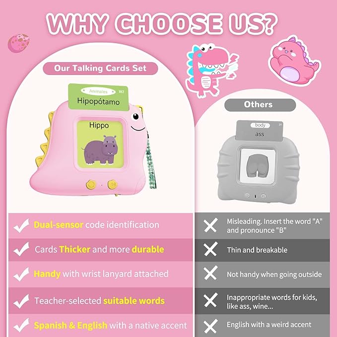 - Toddler Montessori Learning Toys: learn Spanish & English easier in a fun way. This bilingual talking flash card set includes 112 pcs cards with 224 early educational sight words. The content was selected by teachers, which is more suitable for kids to learn. 14 themes covering vehicles, animals, daily necessities, foods, vegetables, fruit, jobs, colors and more. A great speech therapy toy to help preschool-age children improve their language skills and expand their vocabulary.