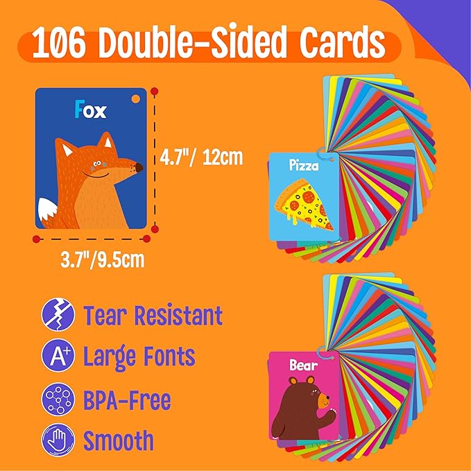 - Double Sided Printing: It comes with 106pcs double-sided cards, the content covers 26 letters, 15 animals, 10 numbers, 13 foods, 10 shapes and colors, 25 at home objects and 7 body parts. It features a cute image and a word on one side, related words or an interactive question on another side, making it an ideal educational tool that engages children in a fun and interactive way.