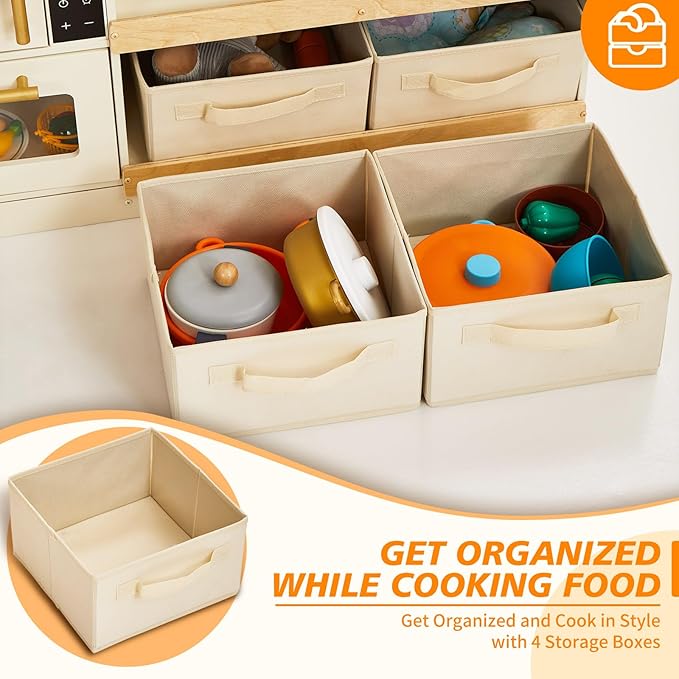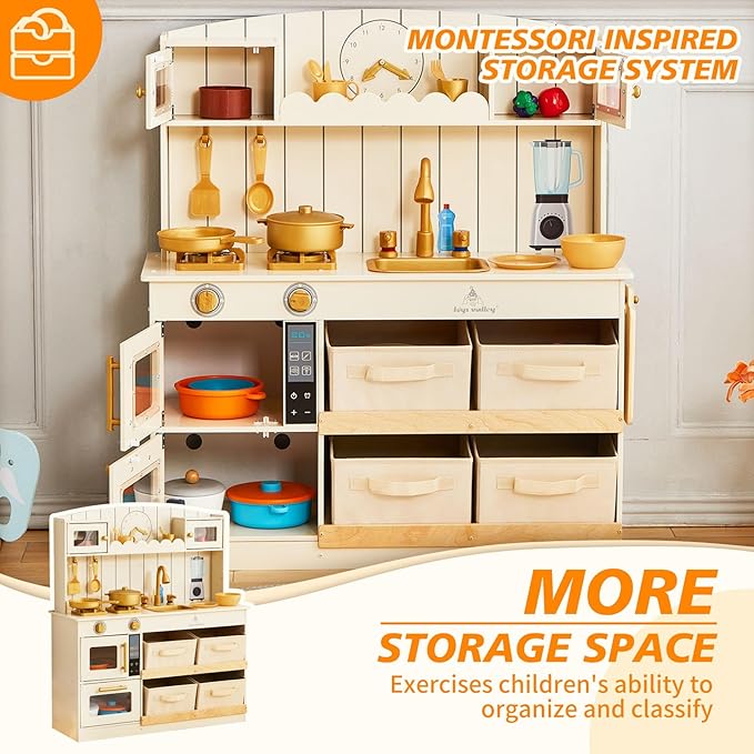 - STORAGE AREAS: This wooden kitchen toy has multiple storage spaces, every kitchen tool for children has a place. Keep dishes, play food accessories more tidy and ready for play.
