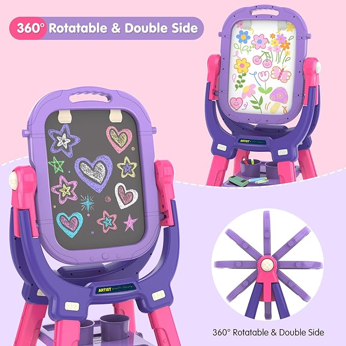 - 360°Reversible Rotatable - Victostar Art Easel with magnetic chalkboard and whiteboard. Two children can play at the same time, the whiteboard supports watercolor painting, while the blackboard can be used to practice calligraphy and study. It is equipped with complete painting tools, which can be rotated 360 degrees to meet the various painting needs of children.