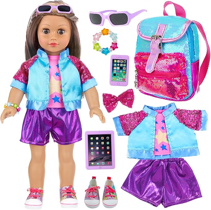 - Package List: 10 pcs 18 inch doll clothes and accessories set - 3 pcs Color Blocking Jacket Set, 1 gradient doll backpack, 1 pair of shoes, 1 bow hair clip, 1 purple framed sunglasses, 1 bracelet, 1 toy tablet, 1 toy phone.