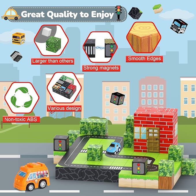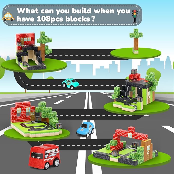- CITY THEME: Step into the magical world of city road with our Magnetic Blocks set! This 110-piece set features vibrant magnetic blocks with 6 adorable cars, sparking endless creativity and fun for kids.