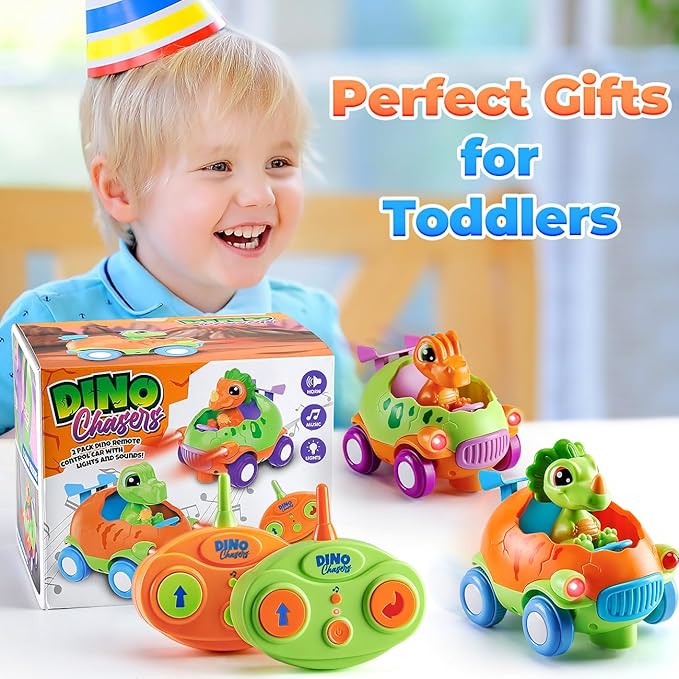 Remote Control Car for Toddlers 1-3: Dinosaur RC Cars Toys for Kids 2-4 with Led Lights Music, Christmas Birthday Gifts for 3-5 Year Old Boys, 2 Packs for Racing