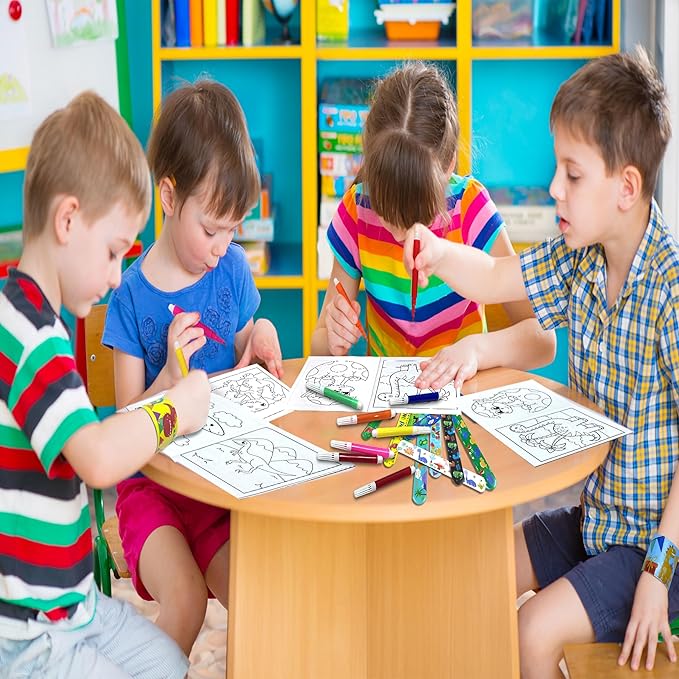 - Package Include: 12 pieces of dinosaur coloring books in 4 styles (5.5x4 inches), 72 pieces of colored pens in 6 colors (3.5inches), 12 thank-you tags (1.77x3.14 inches), 12 slap bracelets (8.6 inches), 12 dinosaur stickers (2.76x7.8 inches) and 12 adorable dinosaur gift bags (4.9x10.6 inches).