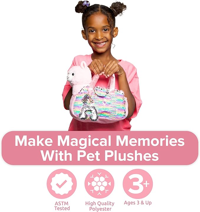 - Flipable Sequin Bag: Girls will love the mini llama plush stuffed animal pet bag with reversible sequins & charm. The handbag features colorful sparkles that flips from one color to another. Kids will enjoy their dog stuffy.