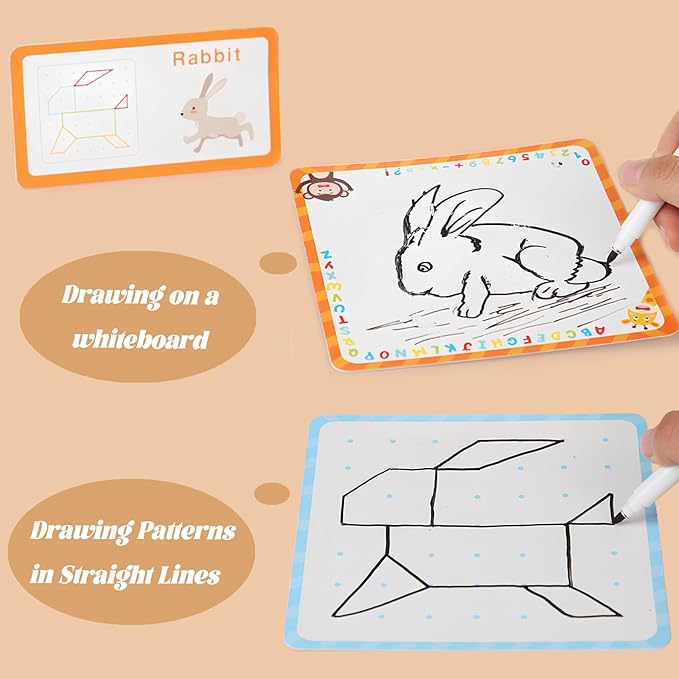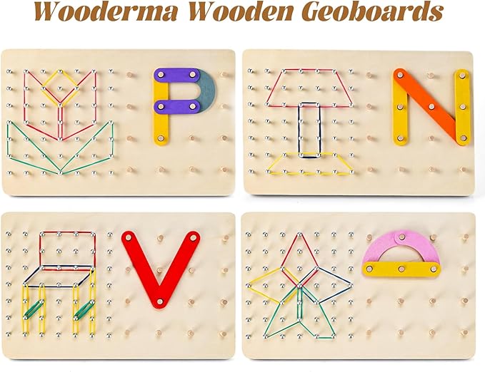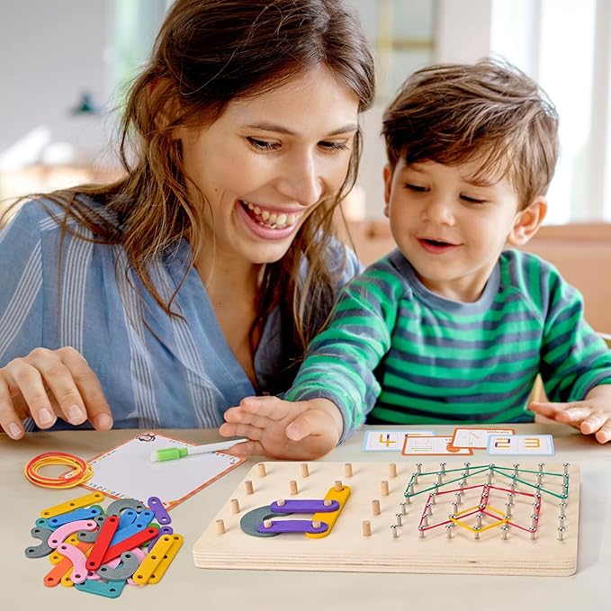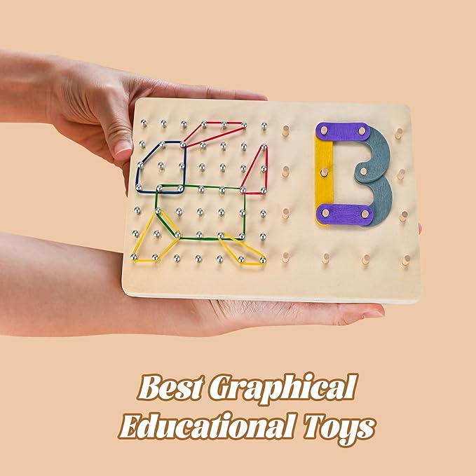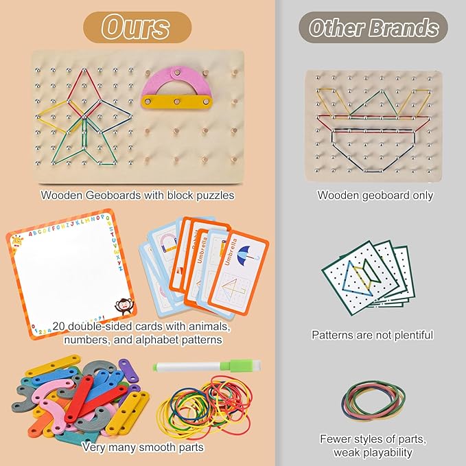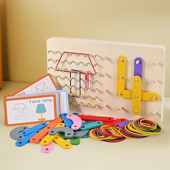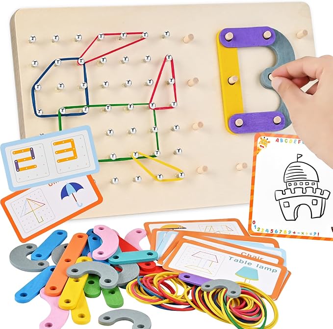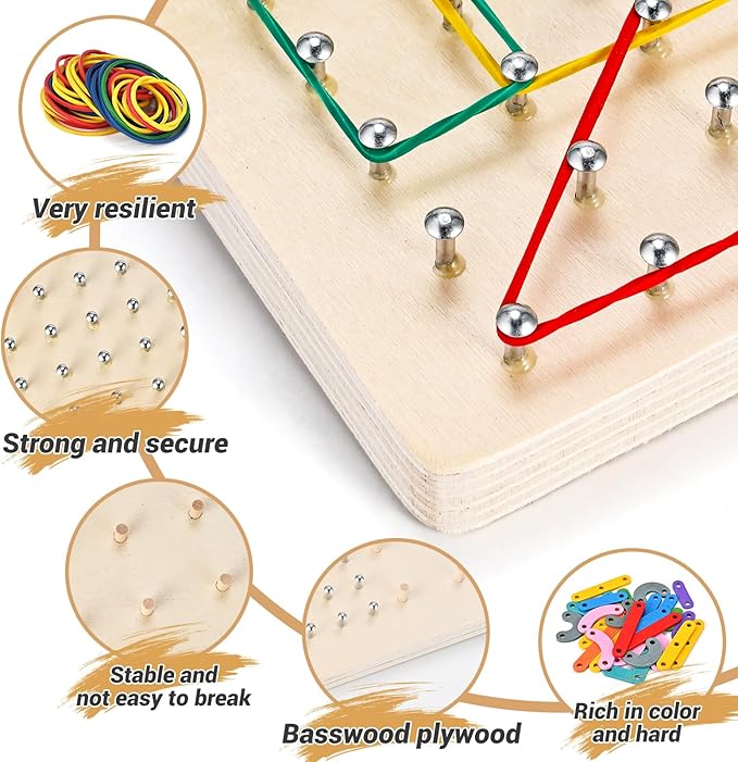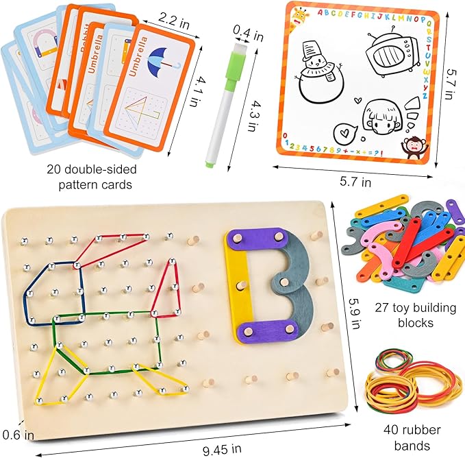 - Wooden Geoboards Board Toys: Our wooden geography board set contains 1 wooden board, 65 nails, 20 double-sided pattern cards, 1 blank cardstock, 50 coloured rubber bands, 27 stacking blocks and 1 pen, children can learn about shapes and patterns and more, help children explore a variety of 2d shapes, while drawing and writing inspire creativity and self-expression!