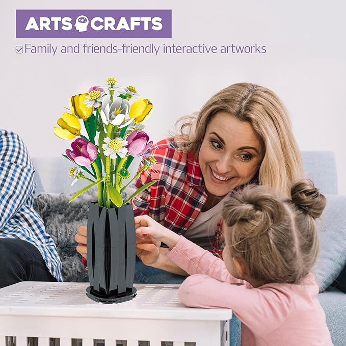 - 【Building Block Tulip Bouquet】 This tulip building block bouquet consists of 1250 pieces, including pink tulips, yellow tulips, daisies, and a vase. Made of high-quality ABS material, the finished product is sturdy and not easily scattered.