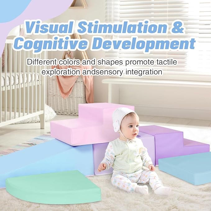 - 6-Piece Set: Baby climbing blocks consists of 1 pink stair, 1 lilac purple stair, 1 azure blue half-moon, 1 lake green half-moon, 1 purple square and 1blue slide. This soft play equipment stimulates your child's imagination to create endless combinations of structures, allowing them to enjoy the fun of the toy as they climb up and down, stacking and swapping four different shapes