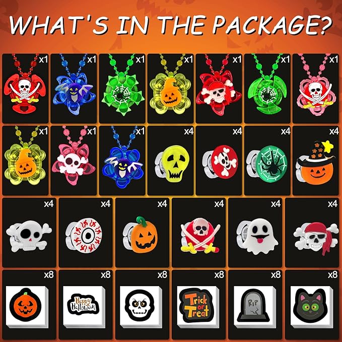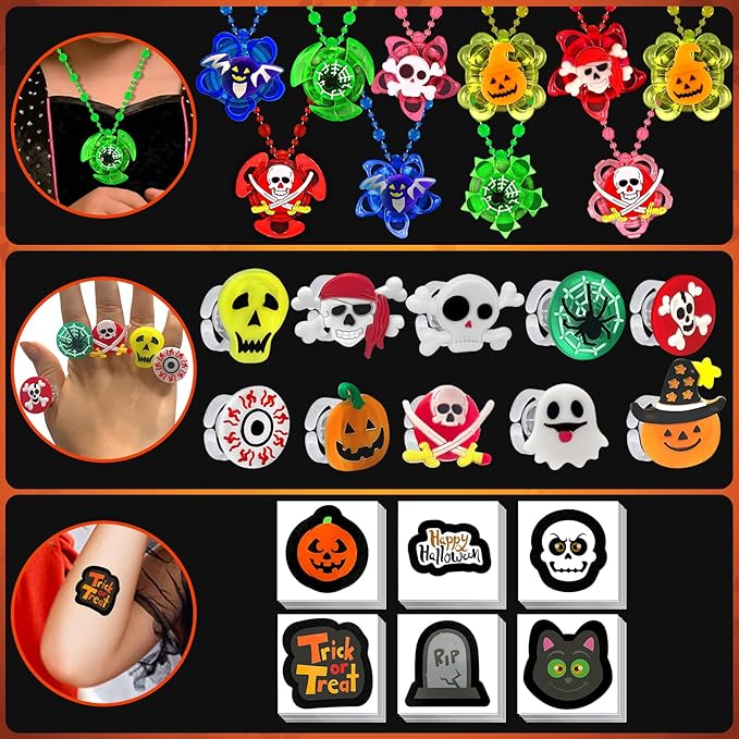 - [ Halloween Light Up Toys ] These light up Halloween toys are perfect. 10 LED Light Up Spinning Necklaces, 40 flash LED rings, 48 Halloween temporary tattoos. totally in 100 pcs. The style may be a little different. Enough quantities and styles for family or friends gathering