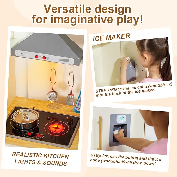 - Plenty of Play Features: This kids kitchen playset includes a range of captivating features, such as a stove and range hood with lights and sounds, a refrigerator, an ice maker, a microwave, an oven, a coffee maker, a sink, and categorized storage baskets. It also comes with 14 pcs colorful accessories to inspire endless imagination. The knobs make a "click-clack" sound, providing tactile and auditory feedback, while the ice maker pretends to dispense ice cubes.