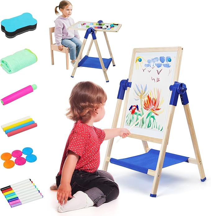 - Versatile: Double-sided toddler easel with a dry erase board on one side and a chalkboard on the other, perfect for creative play and learning. Our easel for toddlers also has art supplies. Our Easel for kids has unique design, it can be used as an art table or a painting desk for children to do homework or play, drawing.