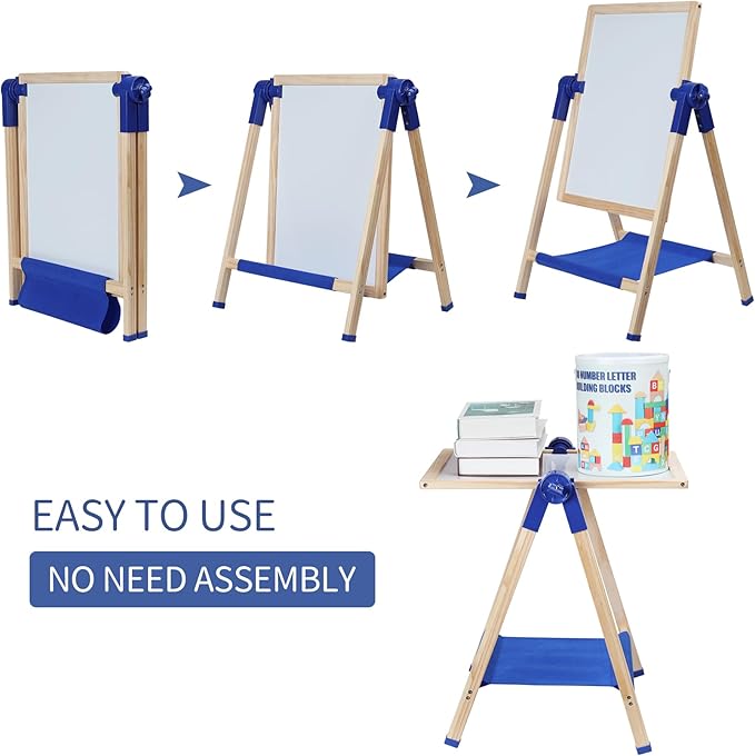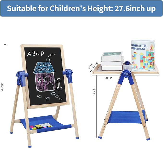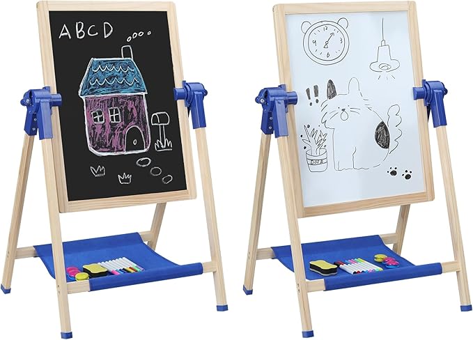- Versatile: Double-sided toddler easel with a dry erase board on one side and a chalkboard on the other, perfect for creative play and learning. Our easel for toddlers also has art supplies. Our Easel for kids has unique design, it can be used as an art table or a painting desk for children to do homework or play, drawing.