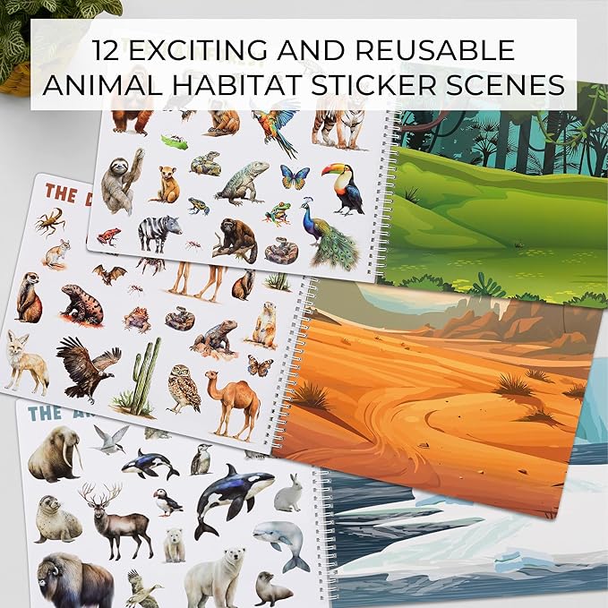 - Super Cute & Diverse - Keeps It Captivating: Perfect craft sticker books for kids ages 4-8! From the Savanna to the Arctic, the kids activity book excites with 12 different “animal habitats” scenes for sticking & coloring