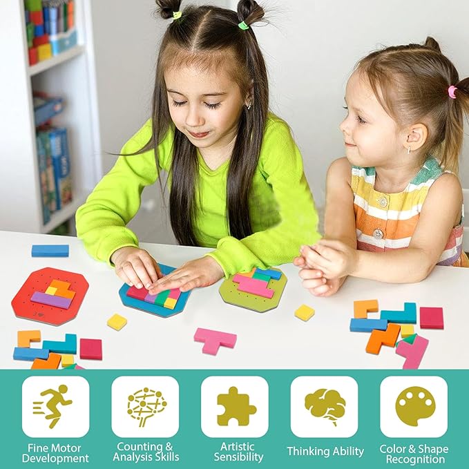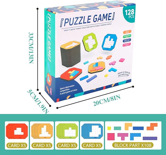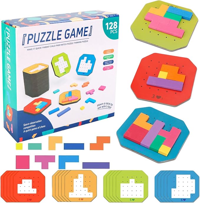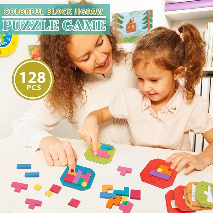 Block Jigsaw Puzzle Games, 128 Pcs Colorful 3D Creative Desktop Wooden Puzzle Game Kids Tangram Math Toys Building Blocks Board, Montessori Puzzle Toys for Kids, Tangram Toy Educational Toys