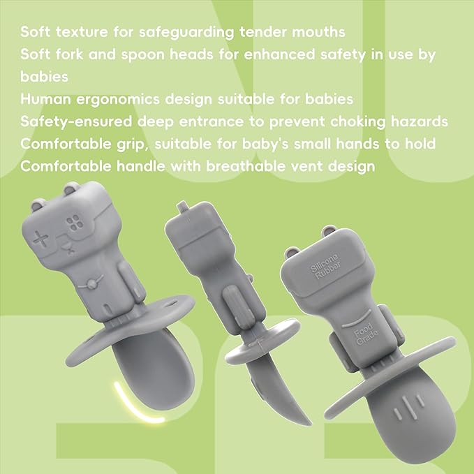 • 【Protective Barrier Design】: The robot silicone self-feeding baby spoons are designed with babies in mind. The baffle limiter can provide extra safety and prevent choking. This baby utensil set is not only suitable for baby to eat, but also prevents the baby from potential harm.