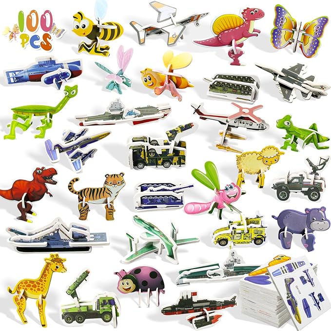 - Easy Assembly: 3D puzzles are straightforward to make. Simply remove the pieces from the template and fit them snugly into the slots. The 3D puzzle set is a mixed pack featuring puzzles with four themes: animals, insects, military, and dinosaurs.Each puzzle varies in complexity, offering challenges suitable for different skill levels