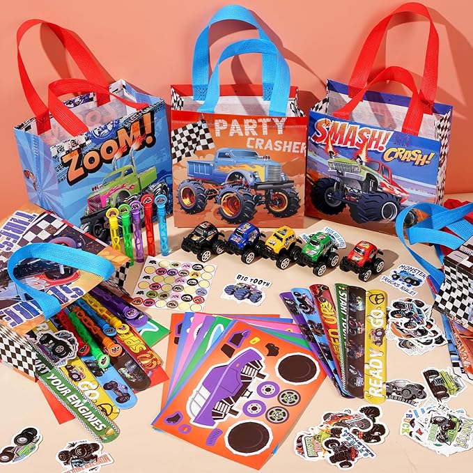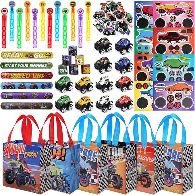 - Perfect Truck Car Party Decorations: Our Set includes 50PCS Stickers, 12PCS DIY truck stickers,12PCS Treat candy bags, 12PCS Slap bracelets in 6 styles,12PCS MINI truck toys,12PCS Bubble wands(with bubble wand mini stickers,you can match your own bubble wand).