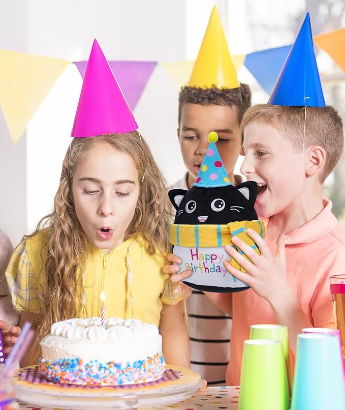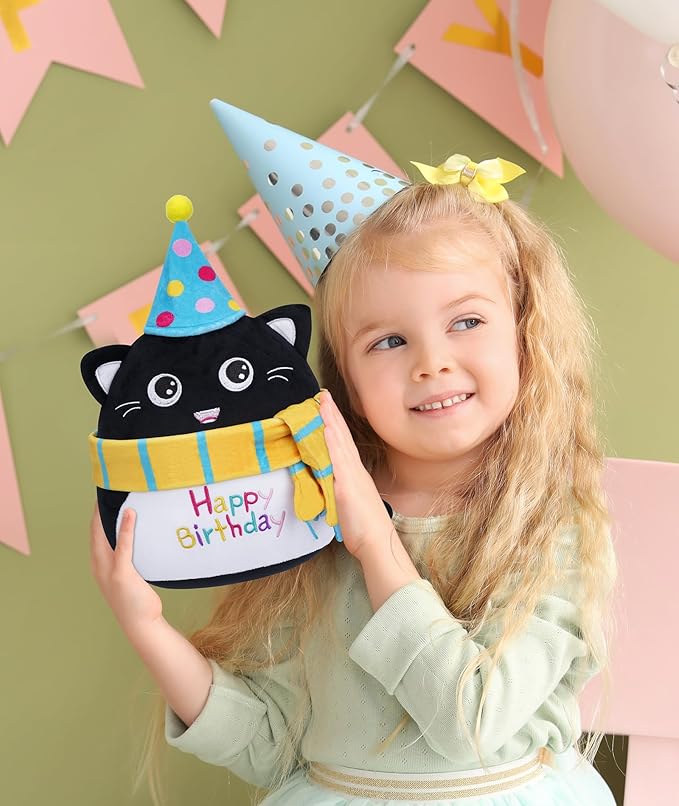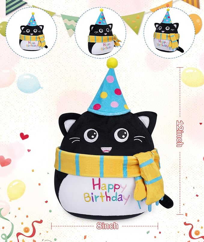 - Unique Birthday Stuff Design: LeYoHa cute black cat stuffed animals features have happy cute pet's expression. The most distinctive feature is that Brithday Hat Plush on the head and the yellow scarf. Looking at it, it seems like saying happy birthday to you. You will really want to give it a big hug. It is the perfect birthday party decor design