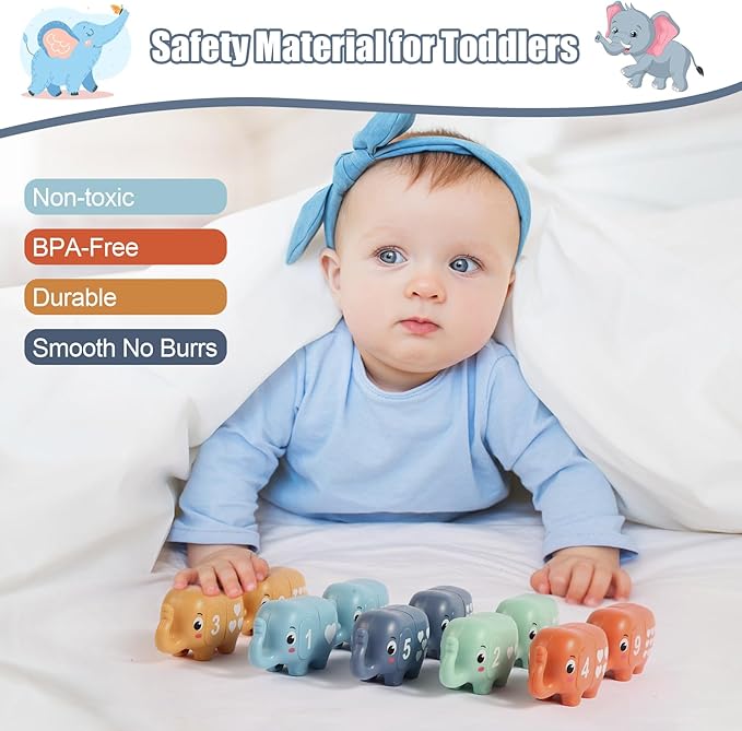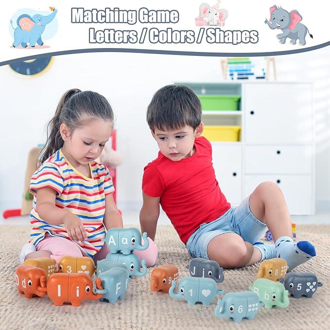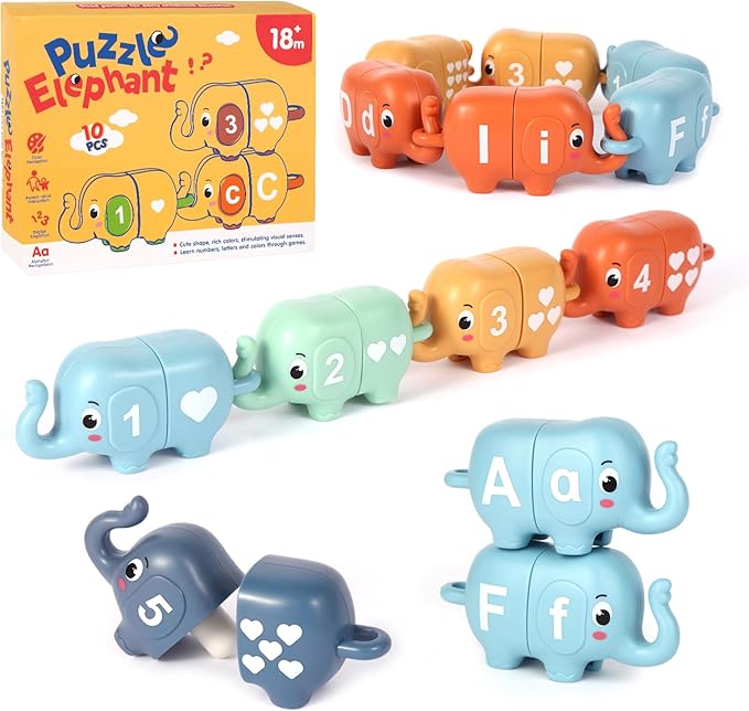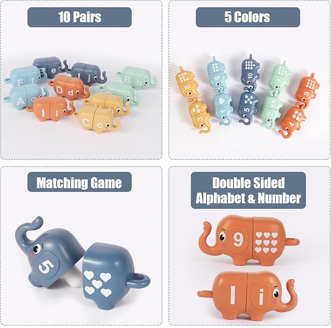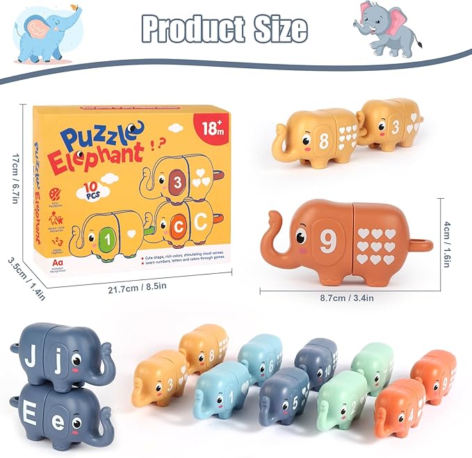 - 【Intersting Matching Game】Chelpopo Preschool Learning Activities includes 10 cute elephant toys, which have double side: Number(1-10) and Alphabet (A-J). Each Elephant Matching Toy can be divided into two parts, then children can play matching games according to the ALPHABET/NUMBER/SHAPE/COLOR.