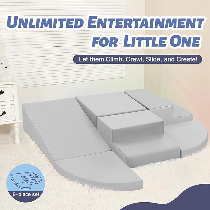 - 6-Piece Set: Baby climbing blocks consists of 2 grey stairs, 2 grey half-moons, 1 grey square and 1 grey slide. This soft play equipment stimulates your child's imagination to create endless combinations of structures, allowing them to enjoy the fun of the toy as they climb up and down, stacking and swapping four different shapes