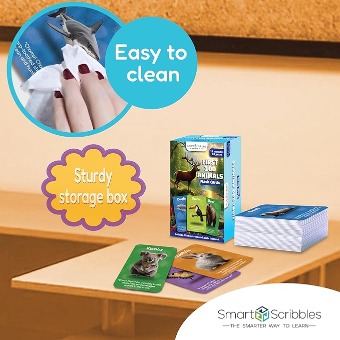 Smart Scribbles Thick Flash Cards for Toddlers - First 100 Animals, Montessori Learning Toys & Educational Games, Ages 18 Months-99 Years, Home Schooling, Travel & Speech Therapy Toys