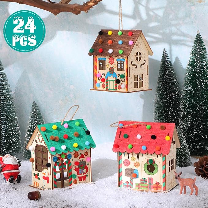 12 Pcs Wood Gingerbread House Craft Kit for Kids DIY Wooden Christmas Birdhouse Craft Kits Holiday Village Houses Make a Gingerbread Wooden House for Xmas Party Game Craft Supplies