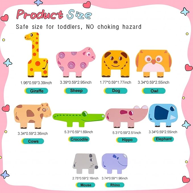 - 【Wood Animal Blocks】toddlers will be attracted by the colorful animal blocks like giraffe, sheep, dog, cow, crocodile, hippo, elephant, mouse, bear, and rhino. This interactive play helps them learn animals and colors, boosting cognitive skills as they explore each piece with curiosity and joy.