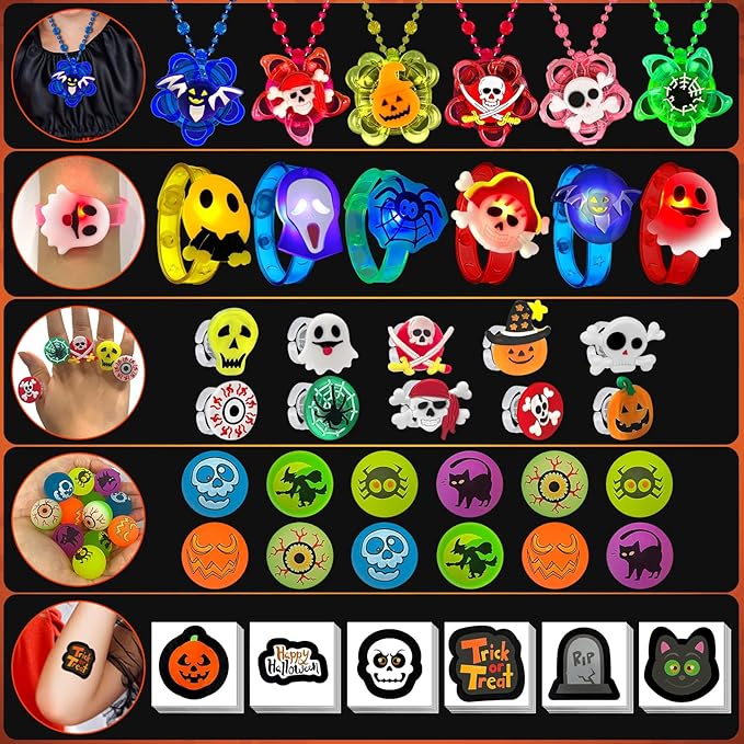 - [ Halloween elements ] Like Pumpkin, Spider, Bat, Ghost, Skull with the bright vibrant colors. The Necklaces Bracelets can be rotating, and led ring can flash for blue or red light, and temporary tattoos will glow in the dark. These light up flash Halloween toys will very popular party favors or kids hot bulk toys or so attractive to kids for Halloween treat bags or Halloween party supplies