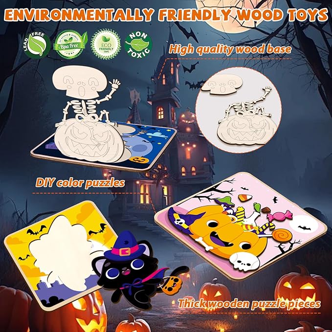 - Halloween gifts designed for kids - This Halloween wooden slices for toddlers comprises 12 packs Halloween Wooden Puzzles that effortlessly fit together, each board measures 14.7*14.7 cm/5.8*5.8 inches. All neatly packed in a vibrant box for easy storage with multiple colors of coloring pens. Designed with 12 styles, this Jigsaw Puzzle for Halloween are wonderful for kids, boys, girls, toddlers, Halloween toys, Halloween gifts, Halloween treats, Halloween party favors, Halloween treat bags.