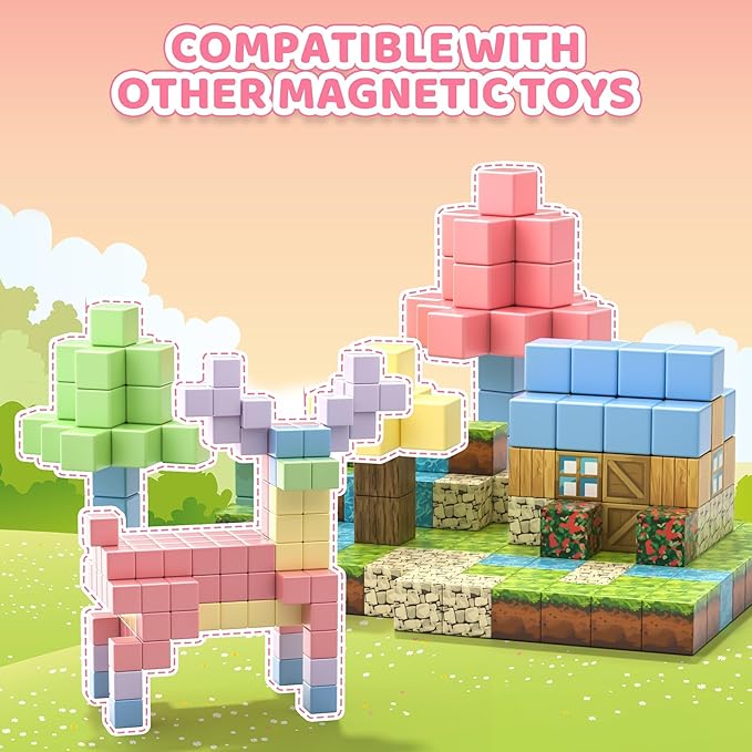 - 64 PCS Magnetic Building Blocks: This magnetic blocks set contains 63 pcs macaron color magnetic blocks, a magnetic toy figurine, a manual and a storage bag. Made of reliable ABS material with a smooth and rounded surface, ensuring safe and worry-free play for children