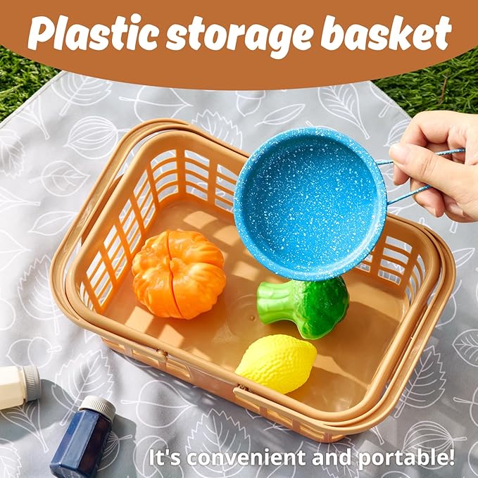 - πγ Kids Play Kitchen Accessories γβ 14PCS set includes: One colander, one stockpot, one pan and one low pot, comes with one covers, one spatula, one ladle, one draining spoon, one spaghetti server, one table mat and 2 spice bottles. There is also a carrying basket to store all the kitchen utensils.