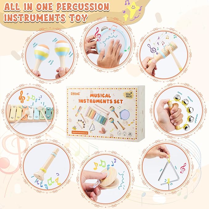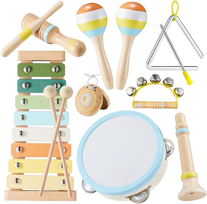 - 🎁【9PCS Toddler Musical Instruments 】This vibrant baby musical instruments set includes a variety of musical instruments perfect for kids, such as a xylophone, wooden sticks, tambourine, clarinet, hand bell, triangle, wood sounder, castanets, and maracas. These montessori musical toys provide everything your toddler needs to create beautiful melodies and explore different tones and rhythms, fostering creativity and imagination. It's an excellent educational toy for early childhood development.